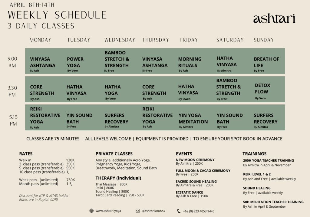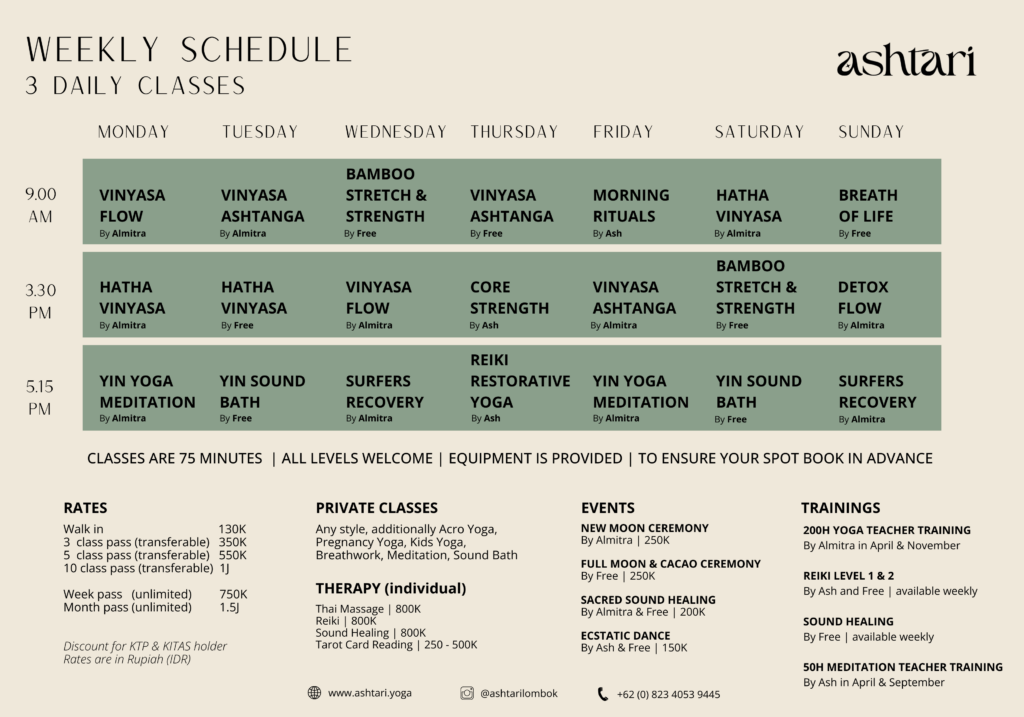 At Ashtari Yoga, we are dedicated to preserving Lombok’s natural beauty through eco-friendly practices. From sourcing local, organic ingredients for our restaurant to minimizing waste and promoting community-based initiatives, we strive to create a positive impact on the environment and the local community. Together, we can nurture both inner and outer harmony.