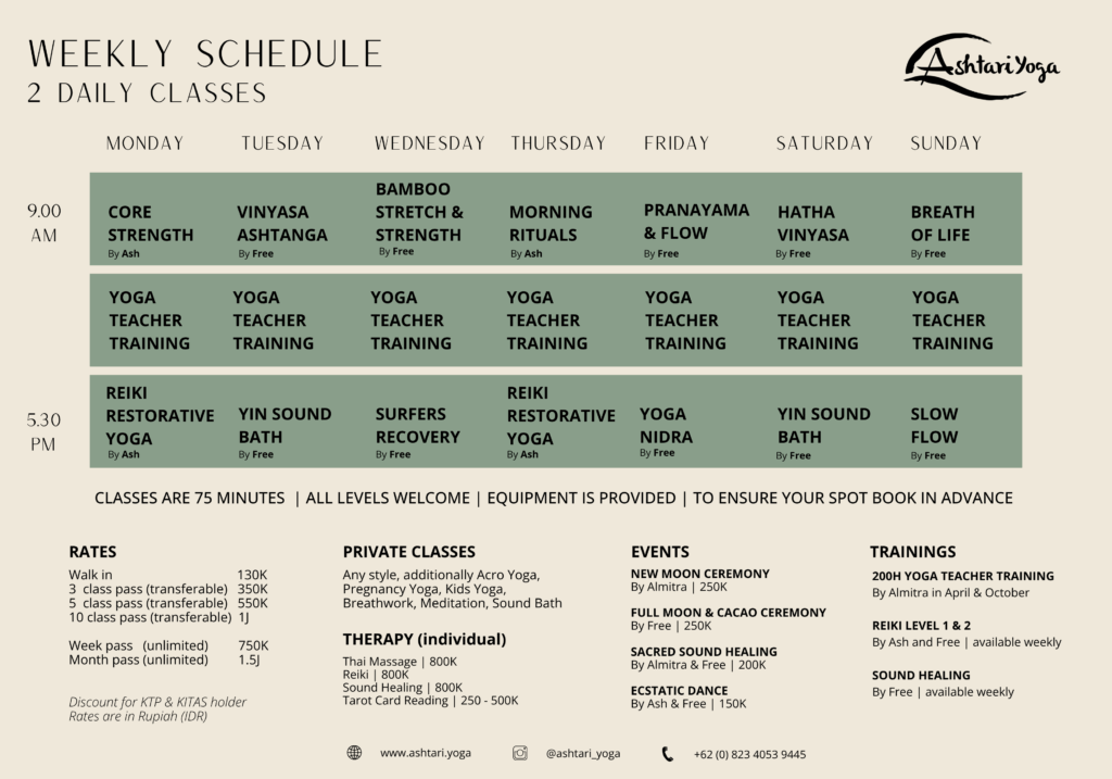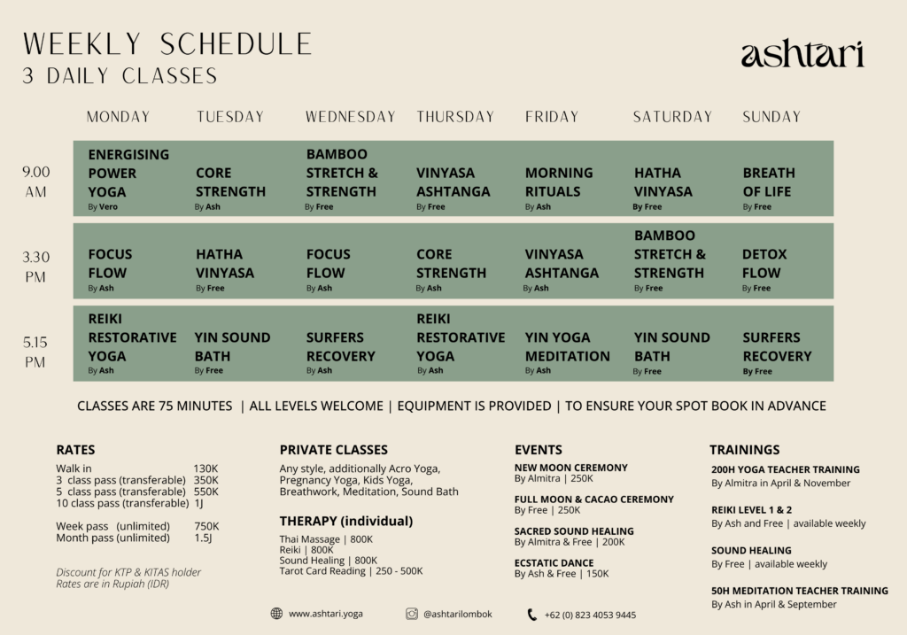 At Ashtari Yoga, we are dedicated to preserving Lombok’s natural beauty through eco-friendly practices. From sourcing local, organic ingredients for our restaurant to minimizing waste and promoting community-based initiatives, we strive to create a positive impact on the environment and the local community. Together, we can nurture both inner and outer harmony.